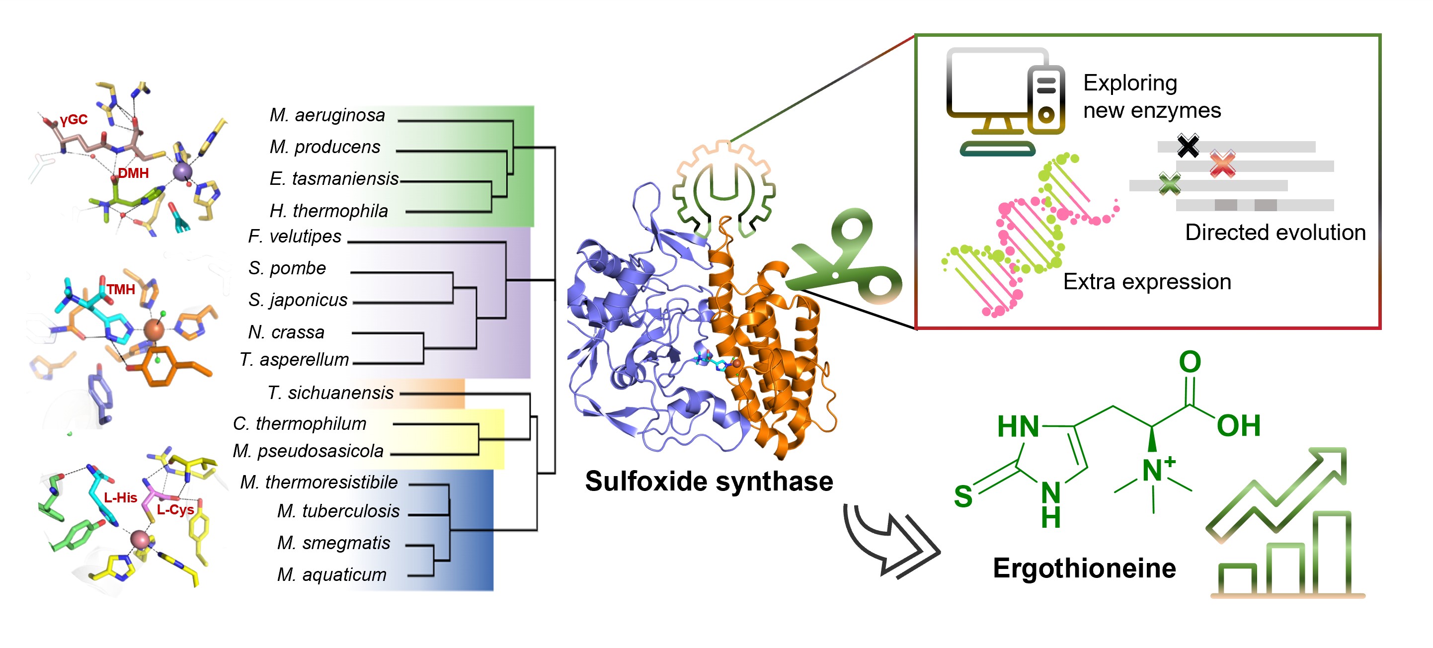 麦角硫因(ERG)作为一种稀有的天然含硫氨基酸衍生物,凭借其卓越的抗氧化性能与多样化的生物活性,在食品、医药和化妆品等行业中备受青睐。随着大众对健康功效认知的不断深入,ERG的市场需求正迅速攀升。在多种生产方法中,微生物发酵因其高产率、低成本以及易于控制等优势,逐渐成为合成ERG的主流策略。其中,亚砜合成酶——一种非血红素铁酶,扮演了关键角色:它催化半胱氨酸与组氨酸衍生物之间形成C-S键,这一步不仅是整....