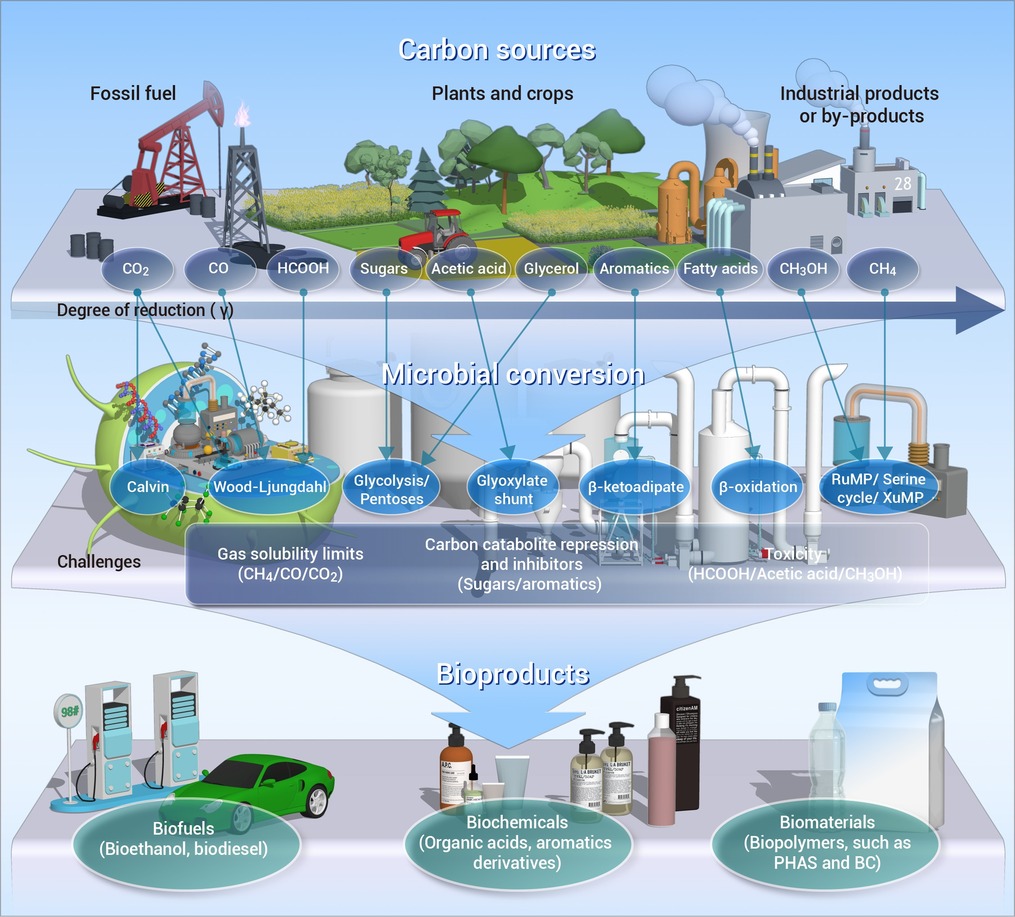 低还原度碳源(如CO2)具有绿色可持续的优势;而高还原度碳源(如葡萄糖、脂肪酸、甘油)因自带能量与还原力,更利于合成生物量与还原性产品。本文系统分析了10类典型碳源,提出“量体裁衣”式碳源利用定制策略,助力绿色、经济生物制造。其中,CO2作为最“清洁”的碳,可与微藻/蓝藻、自养菌或微生物电合成系统相结合,实现工业尾气或直接空气碳捕集及可再生电的转化;固定速率与能量耦联机制的突破,将极大推动绿色生物制造的...